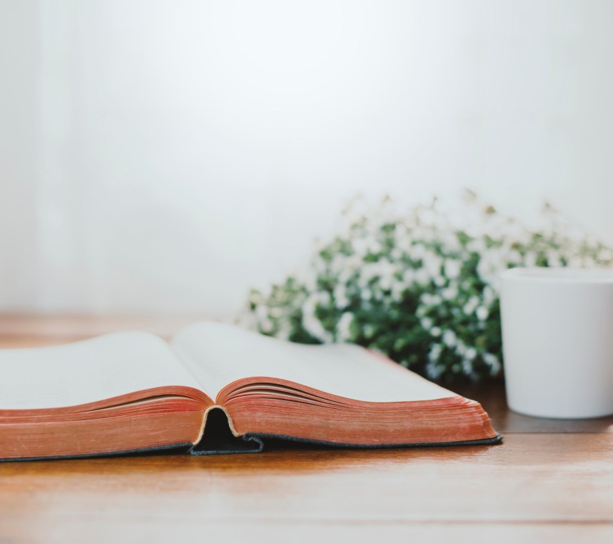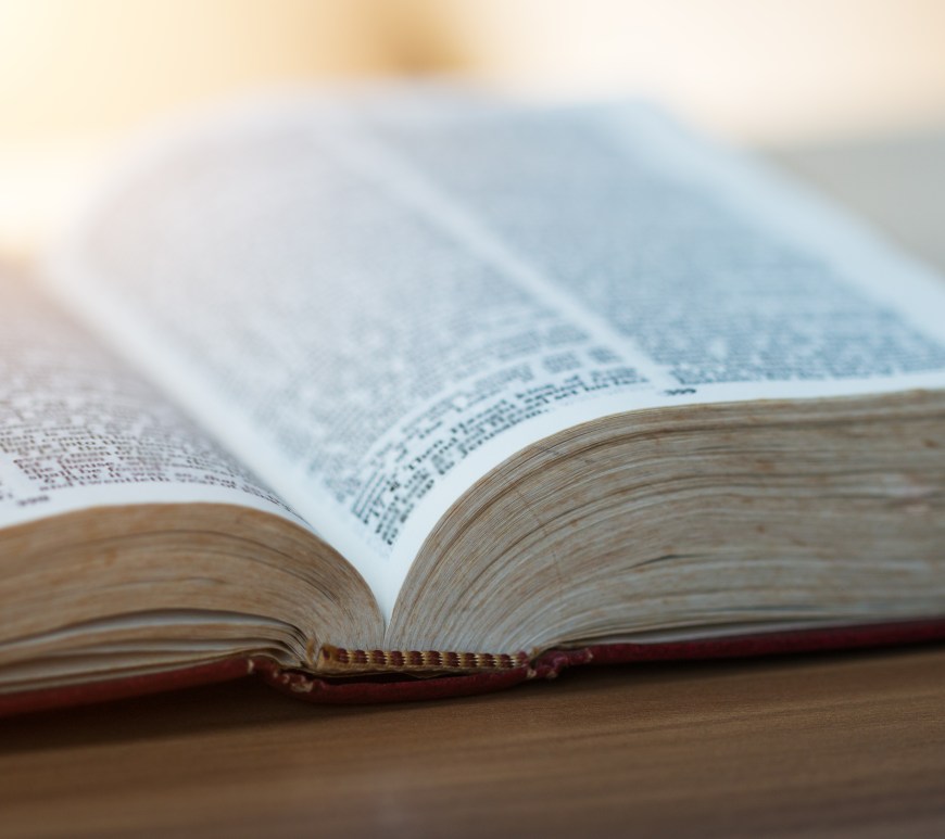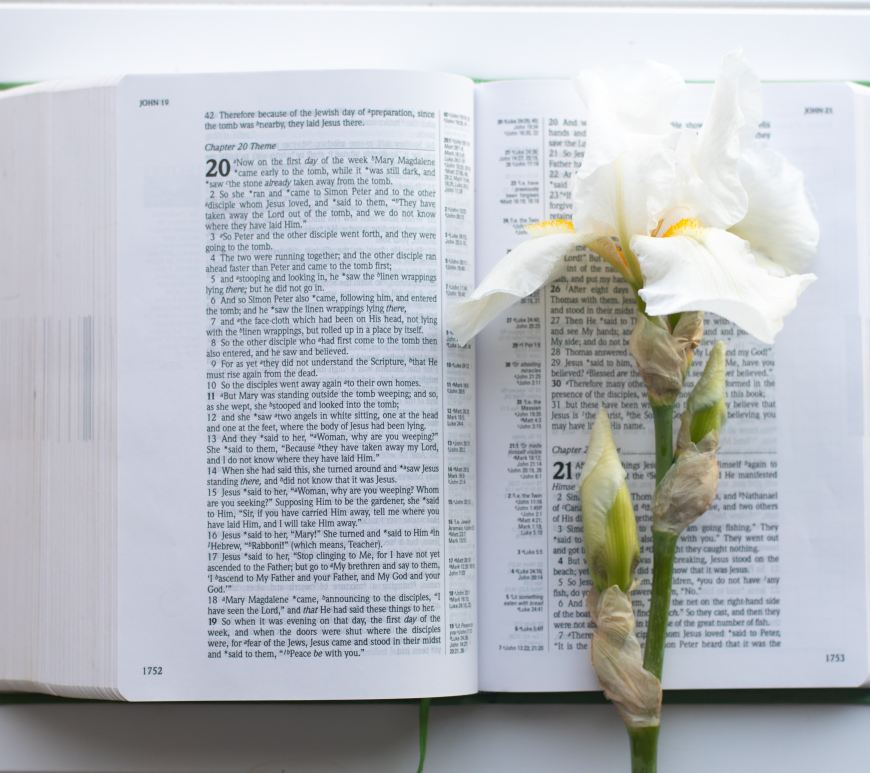 A person in a field holding the Holy Bible.